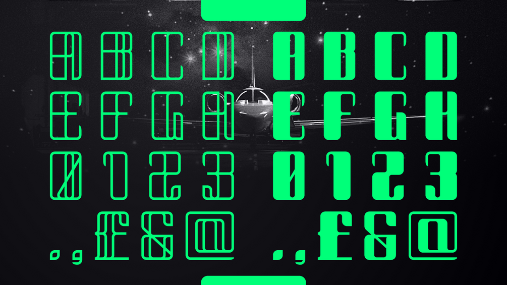 "Exolus" Is an Uppercase Typeface, the lower is a mirror of the uppercase letters but both contain a few stylistic alternatives on a number of letters and numerals. Complete with the usual array of punctuation it is a usable modern futuristic typeface.