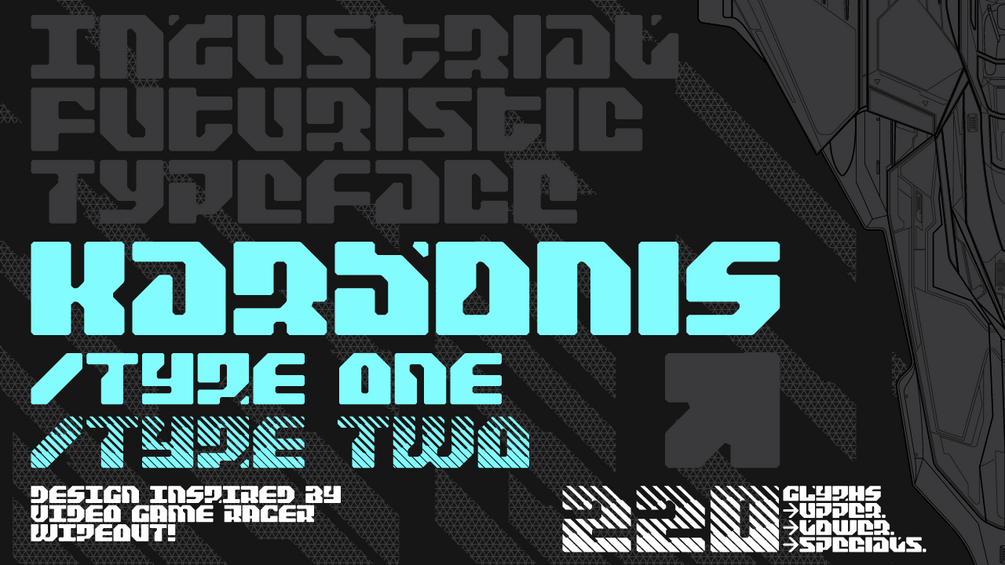 Karbonis typeface is inspired by my love of video gaming and the Wipeout Racing Series from my childhood on the Playstation 2. My fascination with the video game and its feel and design style many years later and led me to create a number of racing livery designs based on teams from the game in Forza Motorsport.